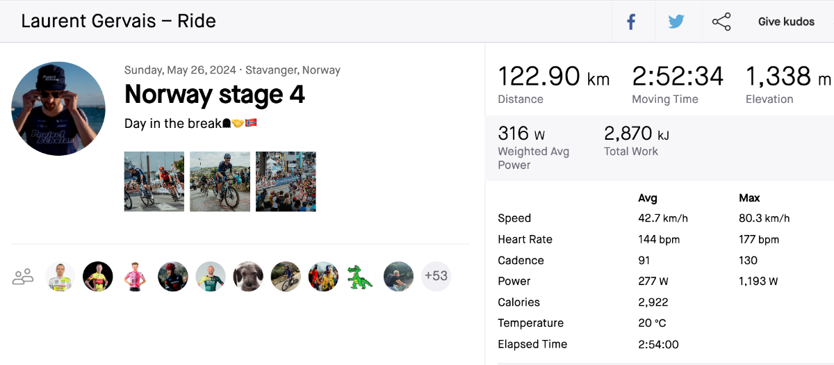While the riders in the WorldTour might be pushing watts that are beyond most of us, the cadence or rpm at which they do it, is fully within reach! Do a quick Strava a search of your favourite pro rider’s average cadence from a big event or epic training ride and you’ll likely find it averages within the 80-100rpm range. Looking at the recent Strava file of Project Echelon’s Laurent Gervais, from his day spent in the breakaway on Stage 4 of the Tour of Norway, we can see he averaged 91rpm for the 123km route, with a max cadence of 130rpm , as measured with his PRECISION 3+ Pro Powermeter.